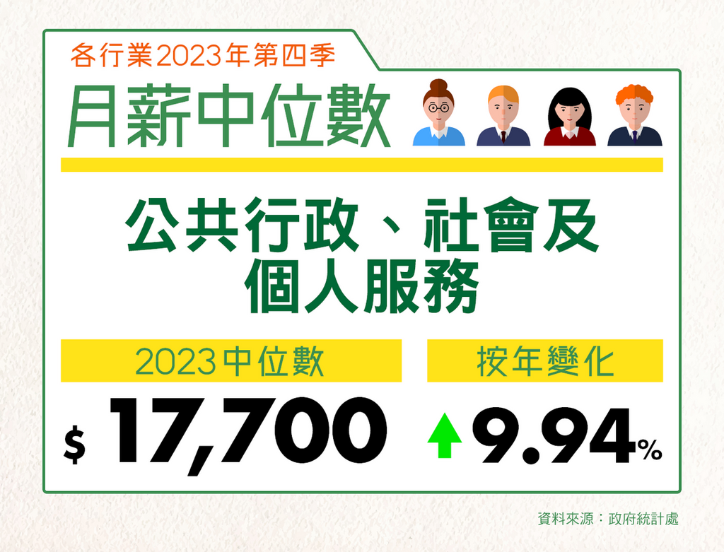 公共行政、社会及个人服务业,月薪中位数为1.77万港元。