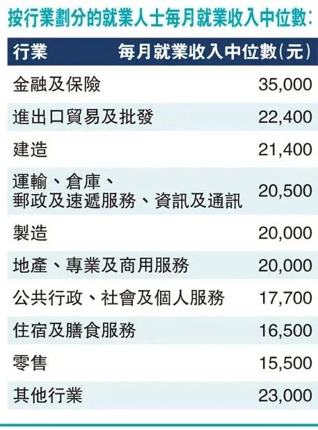 按行业划分每月就业收入中位数的话,最赚钱的行业为“金融及保险”,月薪中位数高达3.5万港元。