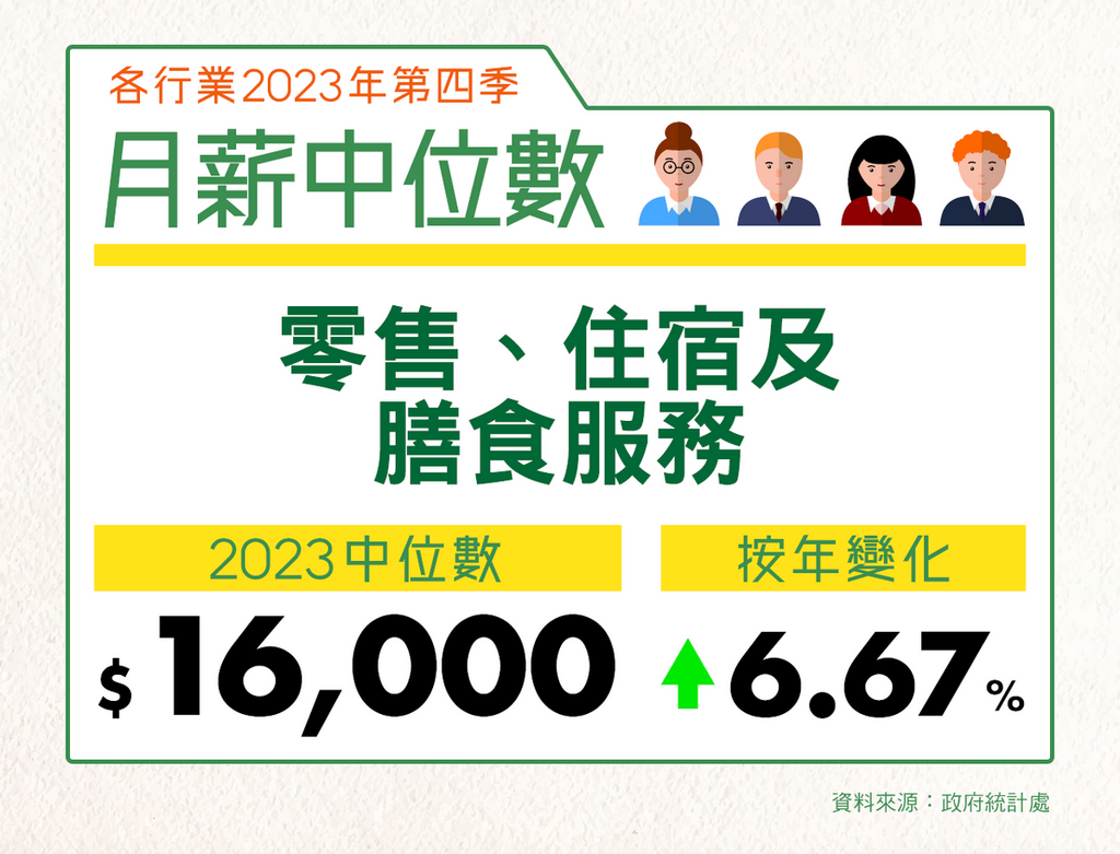 与消费及旅游相关的零售、住宿及膳食服务业月薪中位数为1.6万港元,其中零售业只有1.55万港元,排名最后。