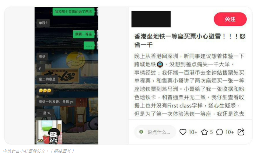 该内地女于小红书以“香港坐地铁一等座买票小心避雷!!!怒省一千”为题发文讲述事件,大叹“听同事建议想着体验一下跨城地铁,没想到差点痛失一千大洋”。楼主表示,她周一(3月18日)晚上从香港返回深圳,依据同事建议想体验“跨城地铁”,于是拿着100元到港铁金钟站售票处买一张“一等座(头等车厢)”单程票到落马州,“和售票小哥讲了两次麻烦买一张一等座地铁票到落马洲。小哥给了我一张收据和粉色地铁卡,和普通票并无二致。”