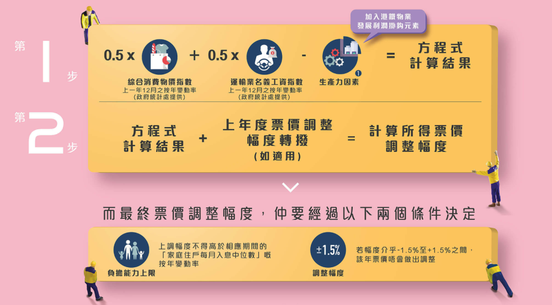 据悉,目前港铁计算票价调整的方程式为:(0.5×上一年12月综合消费物价指数按年变动)+(0.5×上一年12月的运输业名义工资指数按年变动),再扣减与港铁香港物业发展利润挂钩的“生产力因素”。