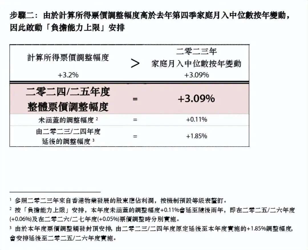 按港府统计处早前公布的数据,“家庭月入中位数”数值为+3.09%,而根据公式计算的结果3.2%高于该数据,因此触发“负担能力上限”条件。最后港铁通过计算确定,今年加价3.09%。