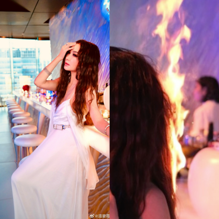 从温碧霞发布在个人社交平台上的照片和事发当时的照片中,可以看到,温碧霞穿着吊带裙,背向靠坐在吧台前,而身后用于烘托气氛的蜡烛,就在她披散着的头发下面。而她也透露,因为披散的长发太靠近蜡烛火源,不慎被点燃,并迅速燃烧起来。