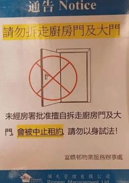记者就改动厨房门事件,访问具多年装修经验的昌师傅。昌师傅指富蝶邨属新式公屋,厨房设备相较旧式公屋完善,厅房大门亦有所改进,能够在火烛时,防止火势蔓延至单位其他地方,固不能拆卸,日后将单位交还给房屋署时,要保持原样。