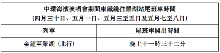 中环海滨举行演唱会期间,东铁綫由金钟站开往罗湖站的尾班车,将延后至晚上11时32分开出,特区政府亦会在罗湖管制站作出相应安排,处理旅客的出入境手续。由各东铁綫车站北行开往上水的尾班车时间,以及南行由罗湖站开出的尾班车时间维持不变。东铁綫往来落马洲站的尾班车时间亦维持不变。