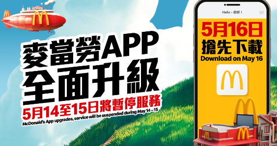 香港麦当劳公司宣布将于5月16日推出全新“麦当劳APP全球版”,据报涵盖60多个国家和地区。目前有关新APP的功能和画面都极为神秘,官方只有表示将会换上全新介面和提供个人化优惠,有趣的是还有全新游戏功能,可以赢取奖品,但未知是否能换餐点。假如你想在麦当劳开生日会,新的全球版APP也会整合预约功能,只要在手机选择派对日期、地点和时间就可以轻鬆完成。
