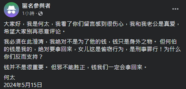 昨日(15日)《东张西望》播出最后一集后,网上的话题亦未有停止的情况,网民除了反应两极外,深夜时分,有位疑似是何太本人亦在群组中发文。这名疑似何太用简体字发文表示有看过大家的留言,更主动澄清与何伯一起并非为了他的钱,但最后又说一定会把钱拿回来:“大家好,我是何太,我看了你们留言感到很伤心,我和我老公是真爱,希望大家别再恶意评论。我必须在此澄清,我绝对不是为了他的钱,钱只是身外之物。但何伯的钱是我的,绝对要拿回来,女儿这是偷窃行为,是刑事罪行!为什麽你们反而支持?钱并不是很重要。但邪不能胜正,钱我们一定会拿回来。”