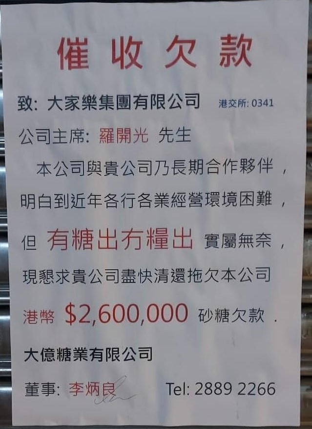 网上流传的催收欠款的告示署名为大亿糖业有限公司董事李炳良,内容指大亿糖业与大家乐为长期合作伙伴,明白到近年各行各业经营环境困难,但“有糖出冇粮出”实属无奈,又“恳求贵公司尽快清还拖欠本公司港币$2,600,000砂糖欠款”。