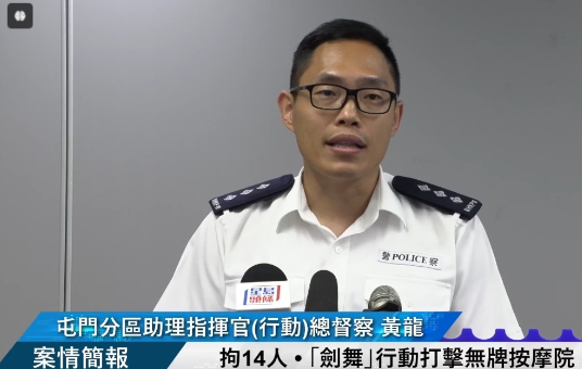 警方屯门分区助理指挥官(行动)总督察黄龙表示,屯门新墟有人经营按摩院,部分更提供性服务,对居民造成极大滋扰,亦成为罪恶温床,警方遂展开打击行动,突击搜查11个目标单位,行动中检获大量避孕套、润滑剂、广告牌及按摩床等证物。