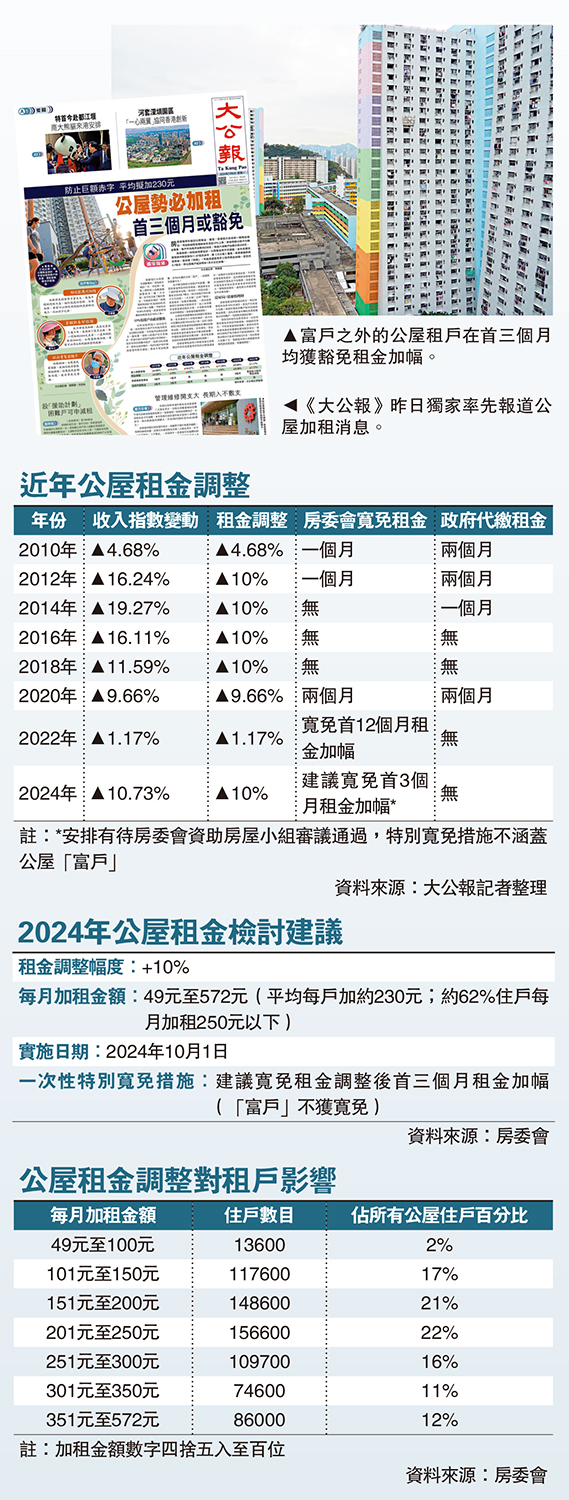 房委会完成新一轮公屋租金检讨,因应租户收入指数有10.73%增长,房委会将按机制加租10%,触及“封顶”机制,公屋户每月需多缴49元至572元,今年10月起生效。为平衡加租影响,房委会建议提供一次性特别宽免措施,除公屋“富户”外,一般租户可宽免首三个月租金加幅,即新租金延至明年一月起实施。