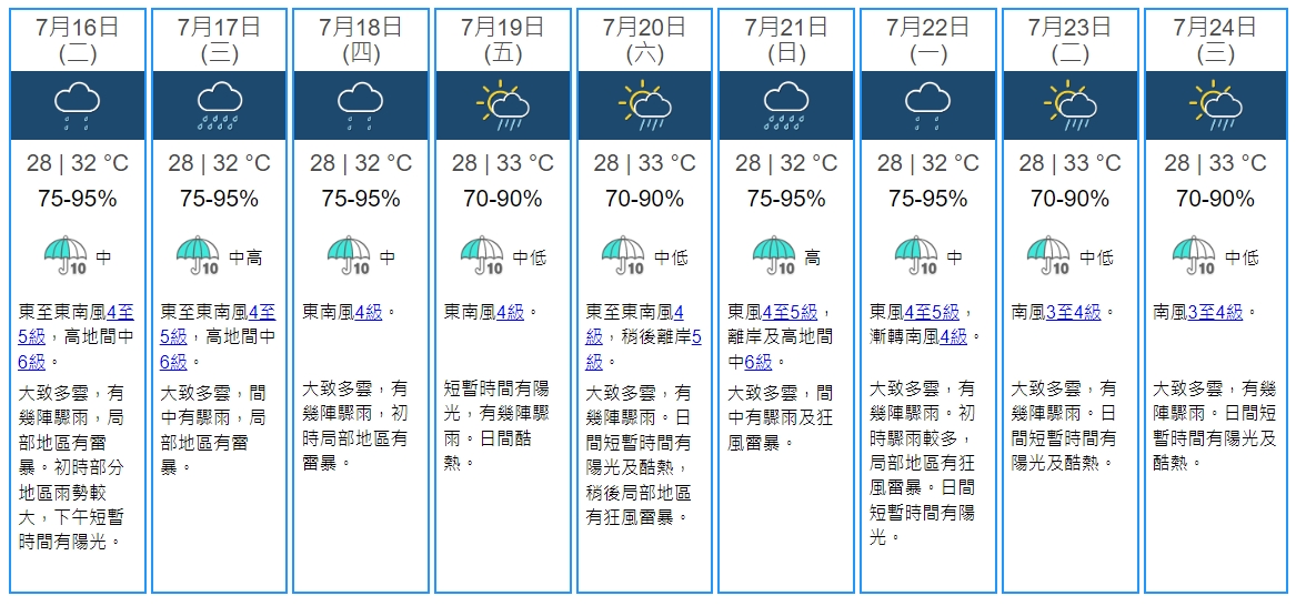 天文台预料今日大致多云,有几阵骤雨; 下午短暂时间有阳光及炎热,新界气温较市区高一两度。 天文台展望未来两三日间中有骤雨,局部地区有雷暴。 本周后期天气酷热,亦有几阵骤雨。