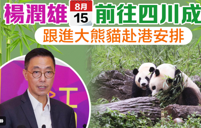 文化体育及旅游局局长杨润雄明日(15日)早上启程前往四川成都,出席有关落实中央政府赠送一对大熊猫予香港特别行政区的合作协议书签署仪式,并跟进大熊猫赴港的安排。香港海洋公园代表亦会随团。