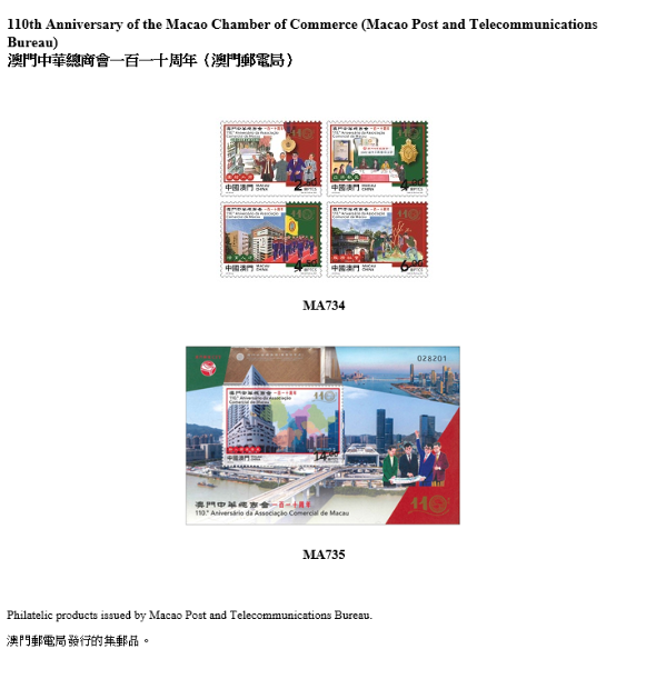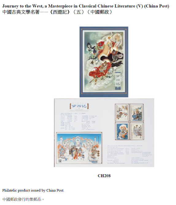 中国邮政推出《中国古典文学名著——〈西游记〉(五)》集邮品,是自2015年发行的《中国古典文学名著——〈西游记〉》系列的第五组。这套集邮品生动传神地描绘多个为人熟悉的故事情节和人物,让人细赏这部经典小说。此外,今年适逢澳门中华总商会成立110周年和《中华人民共和国澳门特别行政区基本法》颁布30周年,澳门邮电局以此为题发行邮品,以作纪念。