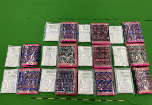 涉案男子昨日从泰国曼谷飞抵本港,海关人员为他寄舱行李进行清关时发现11块尼龙垫,每块尼龙垫夹层中藏有海洛英,共重约13公斤。