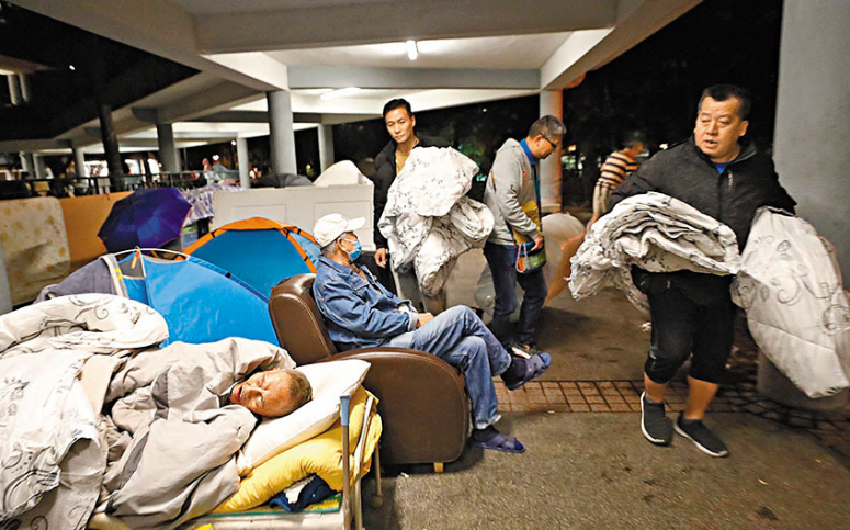 寒流袭港,香港气温急降,天文台昨日发出今年入冬以来首个寒冷天气警告,并预测昨晚至今天早上市区气温最低下降至约摄氏12度。面对突如其来的寒冬,大批基层市民均为抵御寒流而战斗:有无家者用上所有冬天衣物及被褥等以抵抗深夜寒流;有居于天台铁皮屋的长者提前维修漏水的天花板以免寒流入屋;有未及时交电费而被断热水的劏房住户无奈前往避寒中心寻找庇护。然而,弱势社群御寒之路并不孤单,民政事务总署已于昨日上午开放共18间临时避寒中心,多间社福机构亦为露宿者等基层市民派发棉被及食物等,为他们送暖。