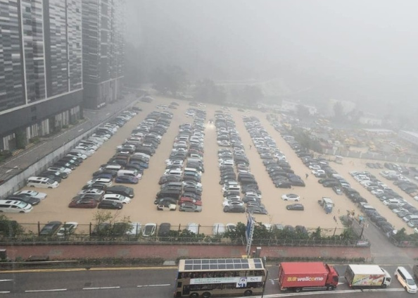有网民上载将军澳一带水浸情况,日出康城对出露天停车场出现水浸,水位淹至车胎一半位置,水凼塞满黄泥。