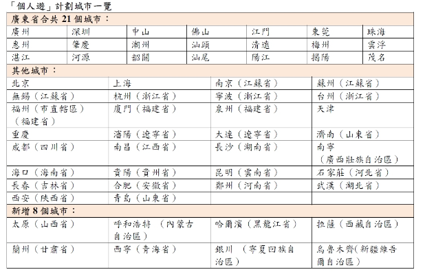 央政府进一步优化「个人游」计划,5月27日起新增8个「个人游」计划城市。 香港旅游发展局主席彭耀佳今日(11日)表示感谢和欢迎,中央政府于三个月内两度新增个人游计划的城市,充分反映中央对香港的全力支持和信心,更是为香港旅游业带来一份礼物。
