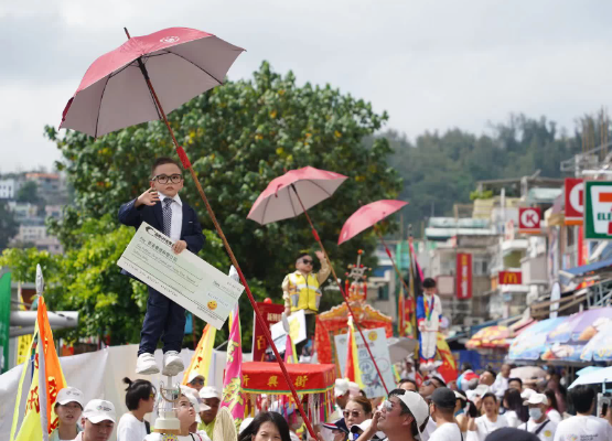 长洲飘色巡游主题丰富,去年就有小朋友扮演陈茂波派糖。