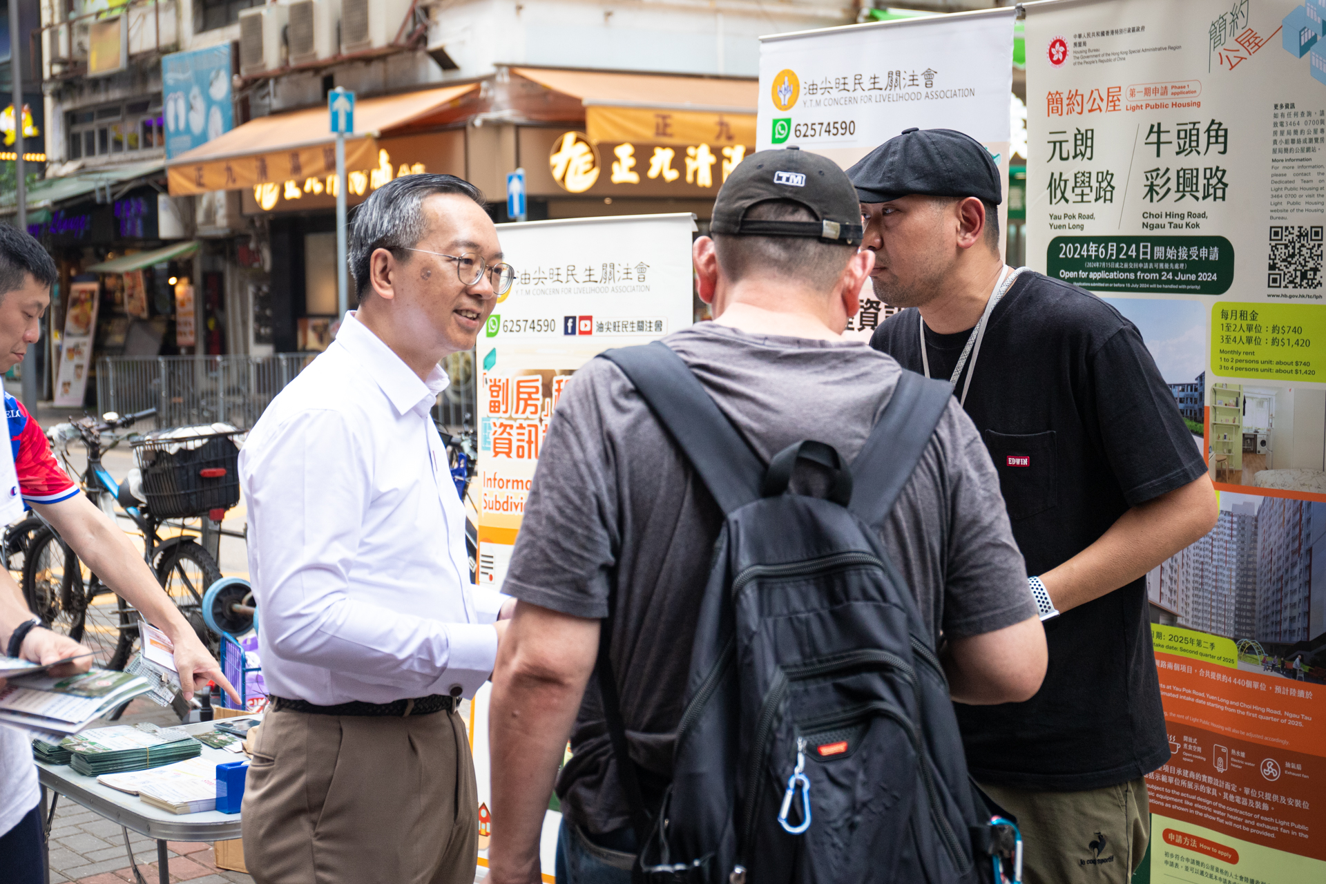 简约公屋本周一起接受申请,房屋局署理局长戴尚诚今日(25日)到旺角街站继续宣传申请资讯。其间,不少市民都驻足查询首批可供申请的简约公屋项目详情、居住年期及什麽情况下可获优先处理等等。