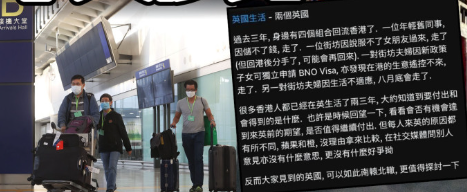 该名移英港人在社交平台发文表示,过去三年,身边有四个组合回流香港了,“一位年轻旧同事,因储不了钱,走了。一位街坊因说服不了女朋友过来,走了。一对街坊夫妇因新政策子女可独立申请BNO Visa,亦发现在港的生意遥控不来,走了。另一对街坊夫妇因生活不适应,八月底会走了。”