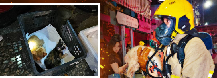 其间消防员在起火劏房救出5隻被困家猫,分别放入发泡胶箱及胶篮内,当中两隻疑因吸入过量浓烟,一度要用氧气罩急救。未几,涉事劏房女户主返回现场,报称早前在家开炉煮食中途离开,至于屋内6隻爱猫,则有一隻下落不明,疑在火警时逃离单位。其后她带同获救的5隻猫登上爱护动物协会车辆离开现场。
